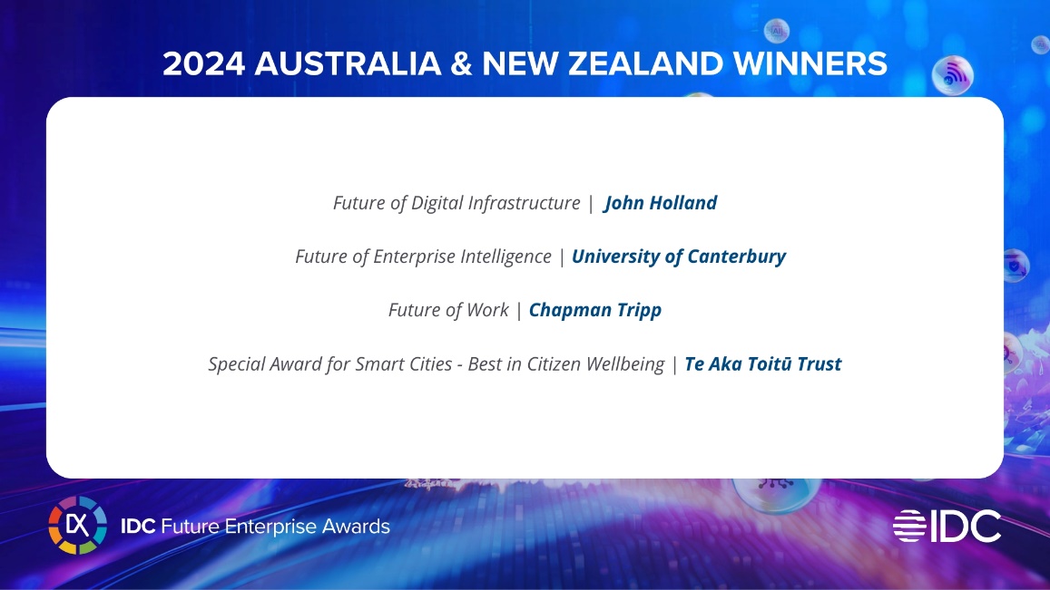 AUSTRALIA & NEW ZEALAND, 01 October 2024 – IDC has announced the winners of the 2024 Future Enterprise Awards (FEA) Australia & New Zealand (ANZ), recognizing outstanding digital transformation (DX) efforts and leadership that harness technology to achieve business success and gain competitive advantage. This year’s awardees are recognized for their leadership in driving innovation through technology, showcasing forward-thinking strategies that reshape industries and enhance digital transformation across infrastructure, education, legal services, and community well-being.