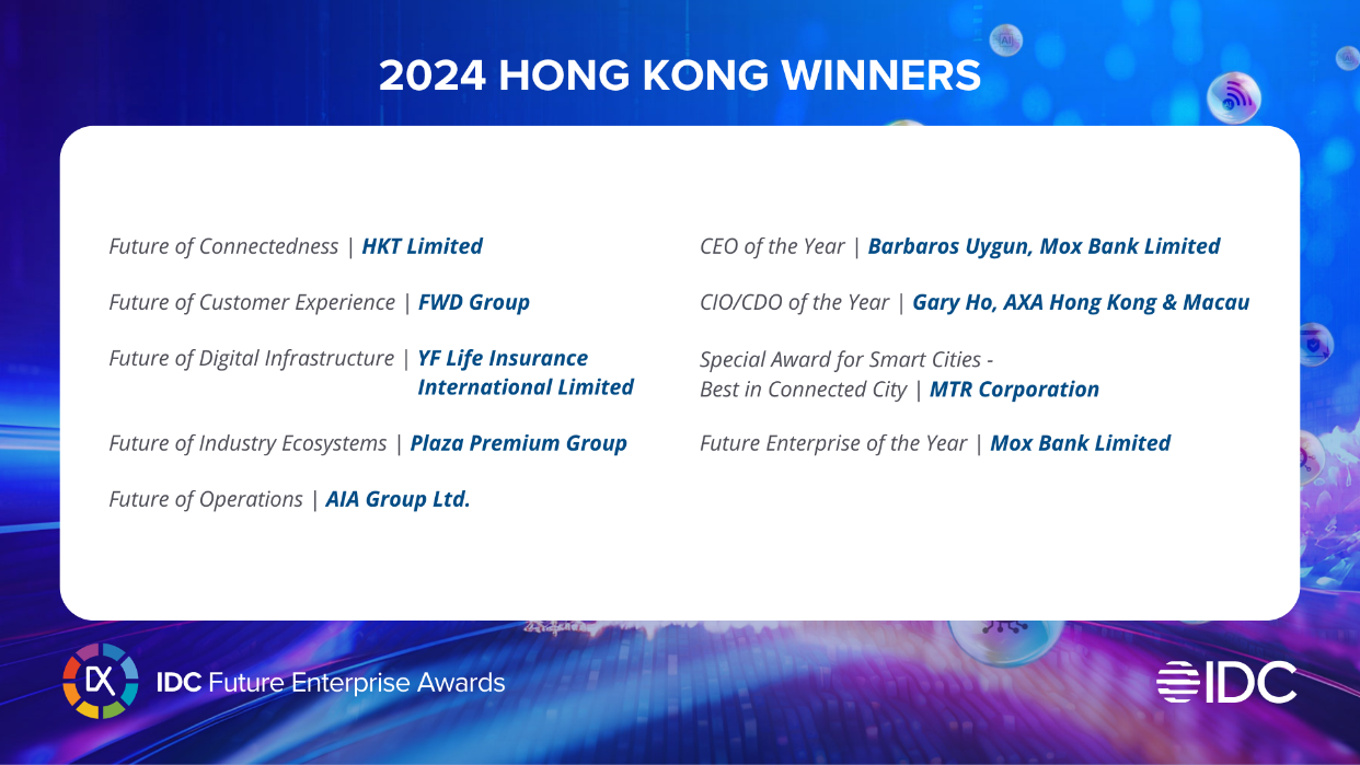 HONG KONG, 03 October 2024 – IDC has announced the winners of the 2024 Future Enterprise Awards (FEA) Hong Kong, recognizing outstanding digital transformation (DX) efforts and leadership that harness technology to achieve business success and gain competitive advantage. This year’s awardees are distinguished for their ability to lead their industries through innovative, technology-driven strategies that represent the evolving digital landscape.