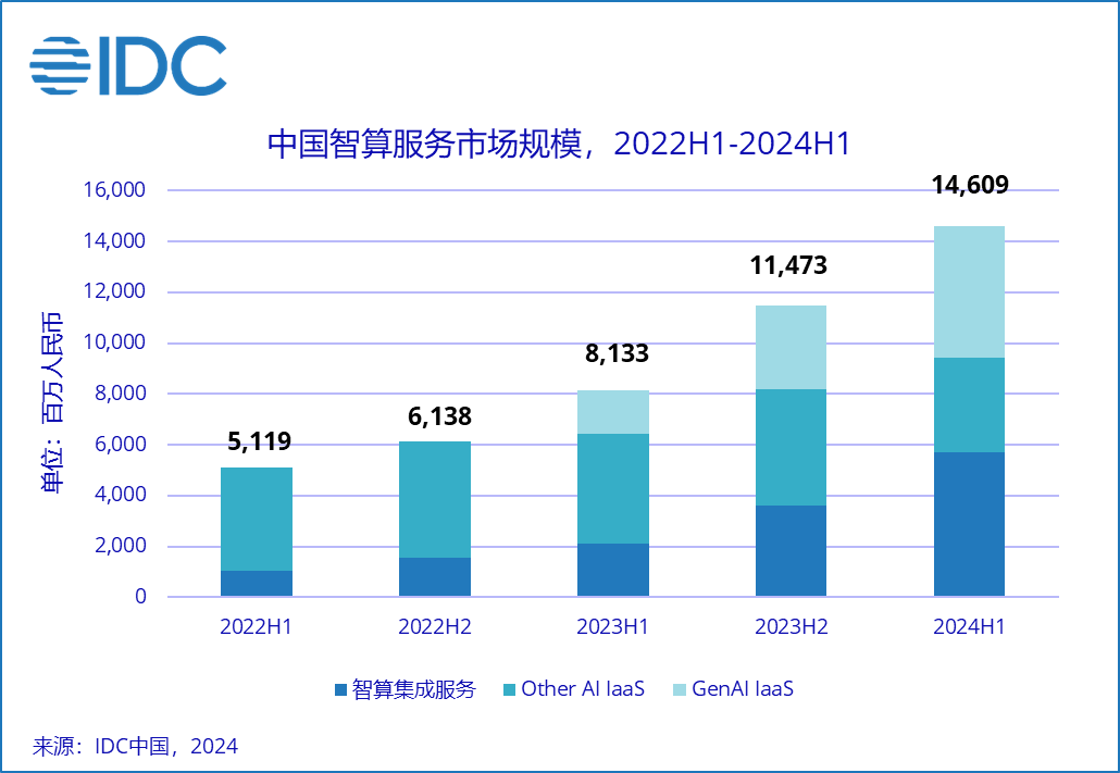 北京,2024年12月16日——国际数据公司 (IDC)最新发布的《中国智算服务市场(2024上半年)跟踪》报告显示, 2024上半年中国智算服务整体市场同比增长79.6%,市场规模达到146.1亿元人民币。其中,智算集成服务市场同比增长168.4%,市场规模达57.0亿元人民币;GenAI IaaS市场同比增长203.6%,市场规模达52.0亿元人民币;Other AI IaaS市场同比缩减13.7%,市场规模达37.1亿元人民币。