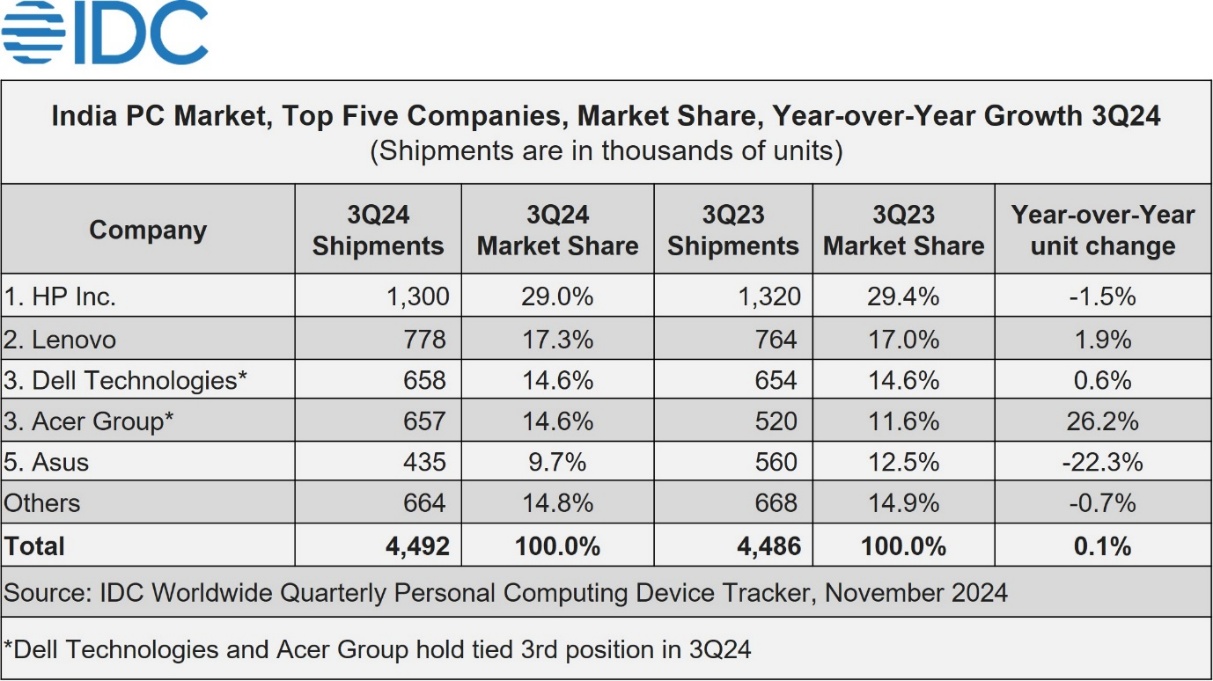 IDC: India’s PC Market Shipped an All-Time High of 4.49 Million Units in 3Q24