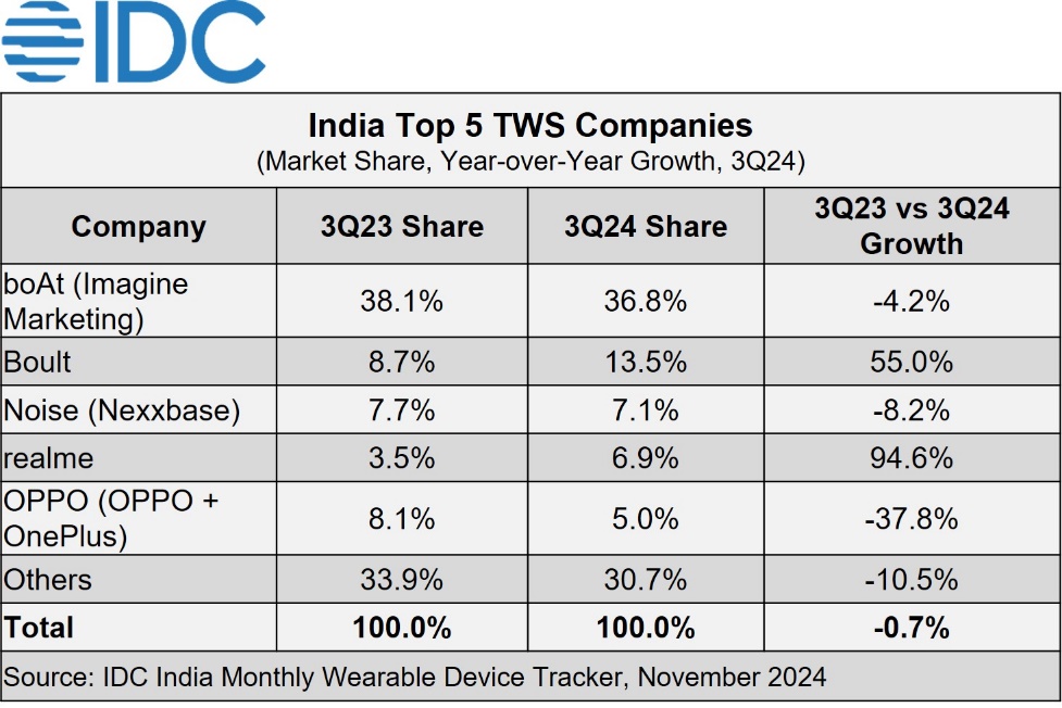 Noise (Nexxbase) continued to lead the smartwatch category, while boAt (Imagine Marketing) focused on stock clearance during festive sales. Boult and realme were the only companies among the Top Five to register growth of 32.5% and 56.5%, respectively. In the TWS category, Boult and realme registered growth of 55.0% and 94.6%, respectively, among the Top Five. The smartphone brand Nothing grew by a healthy 308.2% YoY in the overall wearable market.