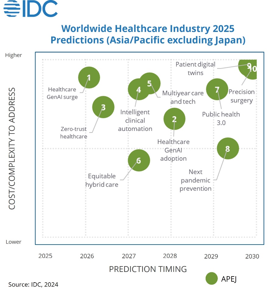 SINGAPORE, 24 January 2025 – According to the recent IDC FutureScape: Worldwide Healthcare Industry 2025 Predictions – Asia Pacific (excluding Japan) Implications, IDC predicts that by 2027, the Asia/Pacific Healthcare industry will save up to $110 billion by significantly optimizing clinical, operational, and administrative workflows through intelligent automation.