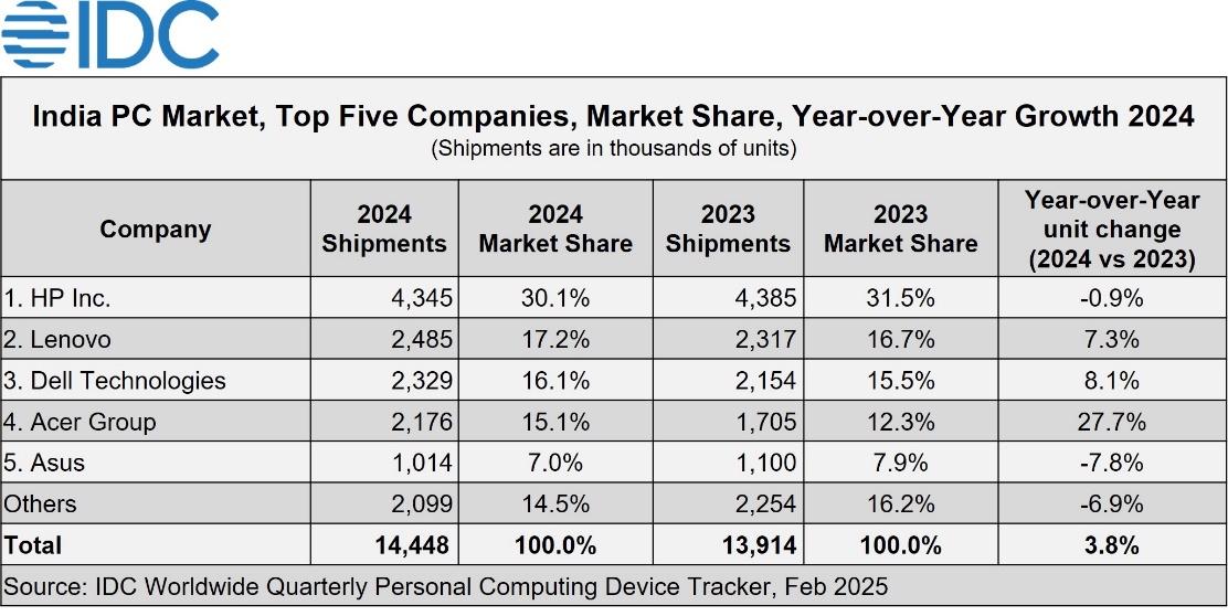 Dell Technologies was third with a 16.1% share in 2024. It continued to hold the second position in the commercial segment with 21% share on the back of the enterprise and SMB segments. However, it dropped to fifth position behind Acer in the consumer segment with 3.9% YoY growth.