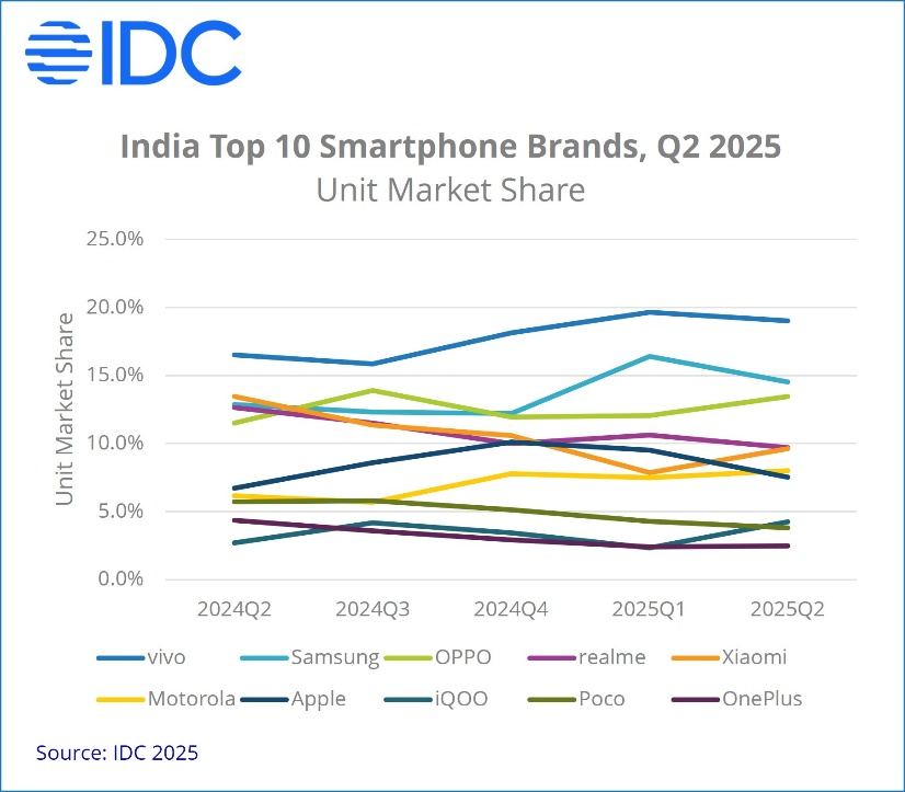 • Shipments to the mass budget (US$100 • The share of entry-premium (US$200 • The mid-premium segment (US$400 • The premium segment (US$600 • The super-premium segment (US$800+) also grew by 15.8% and its share remained flat at 7%. Samsung surpassed Apple for the leadership position at 49% and 48% share respectively. iPhone 16, Galaxy S25/S24 Ultra/S25 and iPhone 16Plus were key models in the segment. Qualcomm-based shipments grew by 37.6% YoY, at 33.9% share, while MediaTek’s share declined to 44.3% from 56.1% on a shipment decline of 15.4% YoY in 2Q25. Shipments to offline channels grew by 14.3% YoY and share increased to 53.6%, while online channel shipments remained flat in 2Q25. The share of online channels dropped YoY to 46.4%, from 49.7% in 2Q24, while QoQ the share increased from 41.9% in 1Q25. Offline growth momentum in recent quarters has been driven by brands’ omnichannel strategies. These include offering lucrative channel margins, deploying in-store promoters, and implementing both temporary and permanent price drops. In response, e-tailers have launched summer sales, providing steep discounts on mid-range and premium devices to stay competitive. As a brand, vivo continues its impressive run, leading the India smartphone market for the sixth consecutive quarter, with a balanced portfolio across price segments and channels. Samsung, a steady second, registered strong growth of 21.0%, led by new model launches across Galaxy A/M/F series, introducing AI-enabled features to mid rangers. Oppo secured the third spot with significant growth fueled by its affordable new K13 and A5x and a focus on service center support. Nothing registered the highest YoY growth of 84.9% followed by iQOO at 68.4%. IDC estimates a low single-digit decline in smartphone shipments for 2025, as average selling prices (ASPs) continue to rise. Ongoing macroeconomic challenges are dampening consumer demand, especially in the budget-friendly segment. As a result, the affordable Android market is contracting, holding back overall market growth. In contrast, iPhones continue to register double-digit year-over-year growth. “The mid-range smartphone market is currently oversaturated with new model launches, leading to intense competition. This could result in excess inventory during the upcoming festive season. In the crucial second half of 2025, brands and channel partners should focus on driving fresh shipments rather than relying heavily on promotions to clear old stock.” says Upasana Joshi, Senior Research Manager, Devices Research, IDC Asia Pacific. Note: This chart/table shows data by IDC’s Brand field. Company ranking may differ where Companies own more than one Brand. *Figures in tables/charts rounded to the first decimal point. -Ends- About IDC Trackers IDC Tracker products provide accurate and timely market size, company share, and forecasts for hundreds of technology markets from more than 100 countries around the globe. Using proprietary tools and research processes, IDC’s Trackers are updated on a semiannual, quarterly, and monthly basis. Tracker results are delivered to clients in user-friendly Excel deliverables and on-line query tools. Click here to learn about IDC’s full suite of data products and how you can leverage them to grow your business. About IDC International Data Corporation (IDC) is the premier global provider of market intelligence, advisory services, and events for the information technology, telecommunications, and consumer technology markets. With more than 1,100 analysts worldwide, IDC offers global, regional, and local expertise on technology, IT benchmarking and sourcing, and industry opportunities and trends in over 110 countries. IDC’s analysis and insight helps IT professionals, business executives, and the investment community to make fact-based technology decisions and to achieve their key business objectives. Founded in 1964, IDC is a wholly owned subsidiary of International Data Group (IDG), the world’s leading tech media, data, and marketing services company. To learn more about IDC, please visit idc.com/ap. Follow IDC on Twitter at @IDC and LinkedIn. Subscribe to the IDC Blog for industry news and insights. All product and company names may be trademarks or registered trademarks of their respective holders.