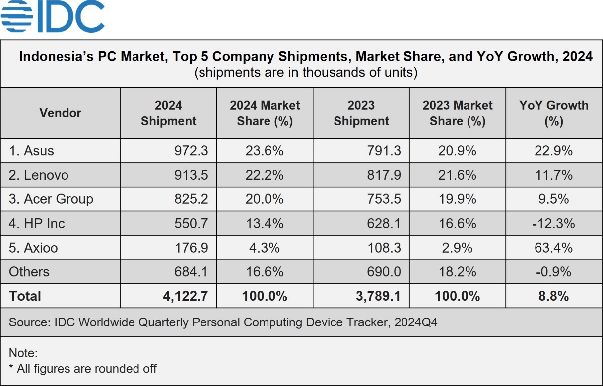 JAKARTA, March 27, 2025 — According to the International Data Corporation (IDC) Worldwide Personal Computing Device Tracker, Indonesia’s PC market saw a total of 4.1M shipments of desktops, notebooks, and workstations in 2024. This volume represents an 8.8% year-over-year (YoY) growth.