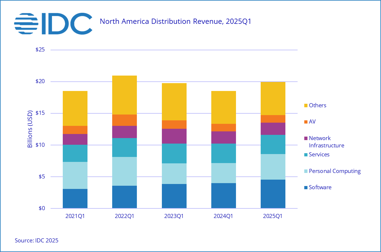 NEEDHAM, Mass., Apr. 29, 2025 – Sales through distribution in North America posted a second consecutive quarter of growth in the first quarter of 2025. Distributor Revenues came in at $19.9B which is a 7.6% increase year-over-year, according to the International Data Corporation (IDC) North America Distribution Tracker (NADT). Personal Computing grew 27.8% year-over-year, far exceeding expectations, while Software came in with a solid 13.2% year-over-year growth.