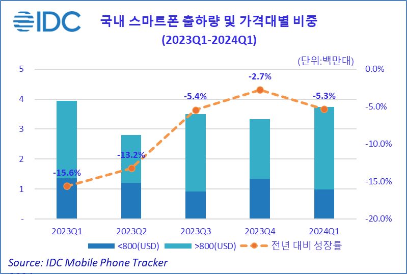 2024년 6 월 19일, 서울 – IT 시장분석 및 컨설팅 기관인 인터내셔날데이터코퍼레이션코리아 (International Data Corporation Korea Ltd., 이하 한국IDC, https://qa.idc.com/kr)는 2024년 1분기 국내 스마트폰 시장의 출하량은 약 373만대로 전년 대비 5.3% 감소했다고 금일 밝혔다. 국내외 경제 불확실성과 신규 스마트폰 가격 인플레이션, 일명 폰플레이션(스마트폰+인플레이션)으로 사용자의 기존 제품 사용 주기 및 중고 스마트폰 수요가 증가하는 추세다. 이는 신규 스마트폰 수요 감소로 이어져 전체 시장 감소세에도 영향을 미친 것으로 분석된다.