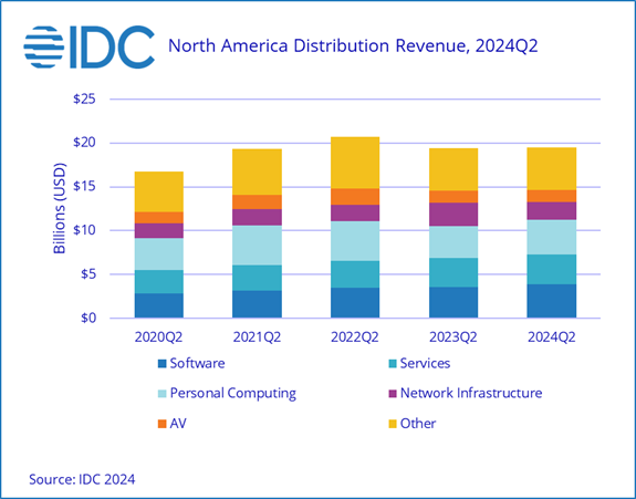 NEEDHAM, Mass., July 24, 2024 – Distributor revenue remained flat year over year at $19.5 billion in the second quarter of 2024 (2Q24), according to the International Data Corporation (IDC) North America Distribution Tracker (NADT). As expected, Network Infrastructure sales saw a double-digit decline from record highs in 2023 after clearing backlogs from previous years. Fortunately, this was offset by close to 10% year-over-year growth in both Personal Computing and Software sales.
