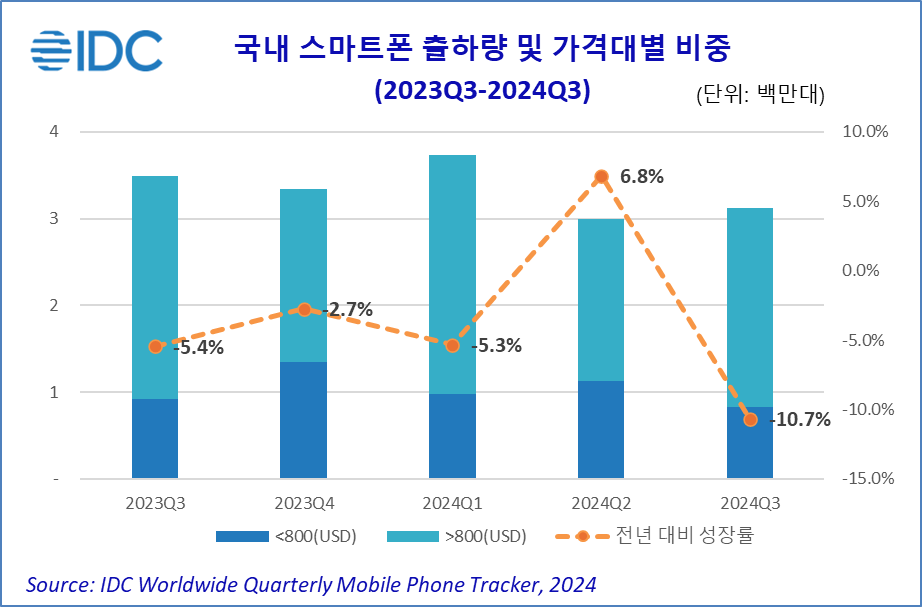 2024년 3분기 국내 스마트폰 시장은 주요 브랜드의 신제품 조기 출시와 AI 스마트폰의 판매 모멘텀이 지속되었음에도 불구하고 역성장을 보였다. 전반적으로 스마트폰 출시가가 인상되며 소비자의 가격 부담감이 커졌다는 분석이다. 나아가 폴더블 폼팩터의 시장 매력도 감소, 신규 AI 기능 출시 지연 등이 수요 감소에 영향을 끼친 것으로 분석된다. 다만 주요 브랜드의 5G 플래그십 및 중저가 스마트폰의 출시로 인해 5G 점유율은 94.7%를 기록하며 5G통신 도입 이후 역대 최고 점유율을 달성한 것으로 나타났다. 가격대 별로는 800달러(USD)이상의 플래그십 제품군의 점유율이 전년 동기 수준인 73.6%를 기록하였다. 앞으로 제조사는 계속해서 프리미엄 제품군 중심의 판매 전략을 지속하고 소프트웨어 업데이트 및 구모델의 AI 기능 확대 적용 등을 통해 AI 스마트폰 시장을 확대하기 위한 기회를 모색할 것으로 예상된다.