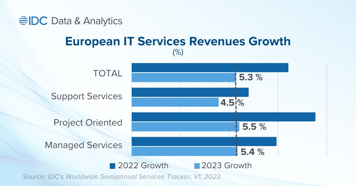 The WE services market recorded nearly double-digit growth year on year in 2022, thanks to strong performances from many leading IT services vendors. IDC predicts a slowdown to 5.4% growth for 2023 due to the impact of the energy crisis, the Russian-Ukraine war, and structural changes in investments in WE countries. A strong rebound is not expected before 2025.