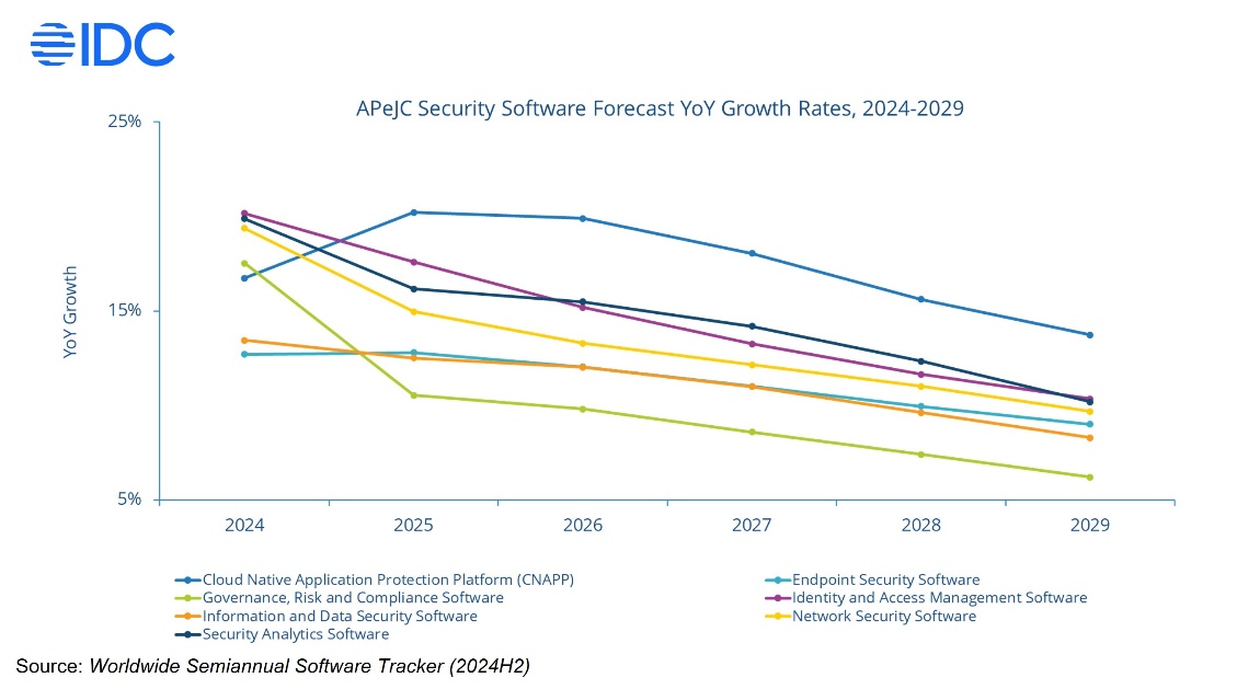 IDC forecasts APeJC security software market revenues to grow at a compound annual growth rate (CAGR) of 12.4% over the 2024-2029 period reaching US$13.4 billion (constant currency) by the end of 2029.