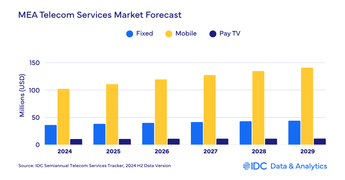 Dubai, UAE, July 15, 2025 – As per IDC’s Worldwide Semiannual Telecom Services Tracker, spending on telecom and pay TV services in the Middle East and Africa (MEA) region reached $149 billion in 2024, increasing 7.7% year over year as compared to worldwide growth of 2.2%. IDC expects the growth momentum of telecom and pay TV services spending in the MEA region to continue, with year-over-year growth of 7.3% in 2025 to reach a total of $159.9 billion. However, the possible impact of ongoing geopolitical developments in the region had not been fully assessed at the time this data was published.