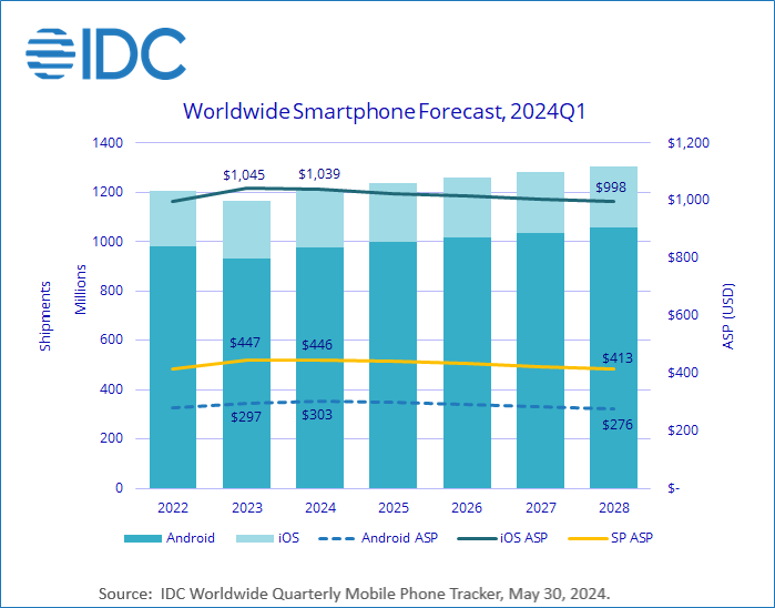 NEEDHAM, Mass., May 30, 2024 – Worldwide smartphone shipments are forecast to grow 4.0% year over year in 2024 to 1.21 billion units, according to the International Data Corporation (IDC) Worldwide Quarterly Mobile Phone Tracker. The growth in 2024 adds momentum to the overall recovery IDC expects throughout the forecast as consumer demand slowly rebounds from the dismal past few years. The recovery will continue in 2025 with 2.3% growth expected, followed by low single-digit growth for the rest of the forecast period, resulting in a five-year compound annual growth rate of 2.3%.
